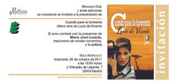 El acto tuvo lugar en la discoteca Morocco, gracias a la gentileza de su propietario, Juan Antonio Fernández, compañero de la Peña Periodística Primera Plana. En la misma estuve acompañada, además de por un montón de amigos y numerosas compañeras escritoras de novela romántica, por Nieves Calvino, traductora literaria, que fue la encargada de hacer la presentación en nombre de la persona que realmente estaba previsto que lo hiciera pero a quien un accidente de última hora se lo impidió, la también traductora literaria María José Losada, y mi editor, Ángel Jiménez, director de Éride Ediciones.